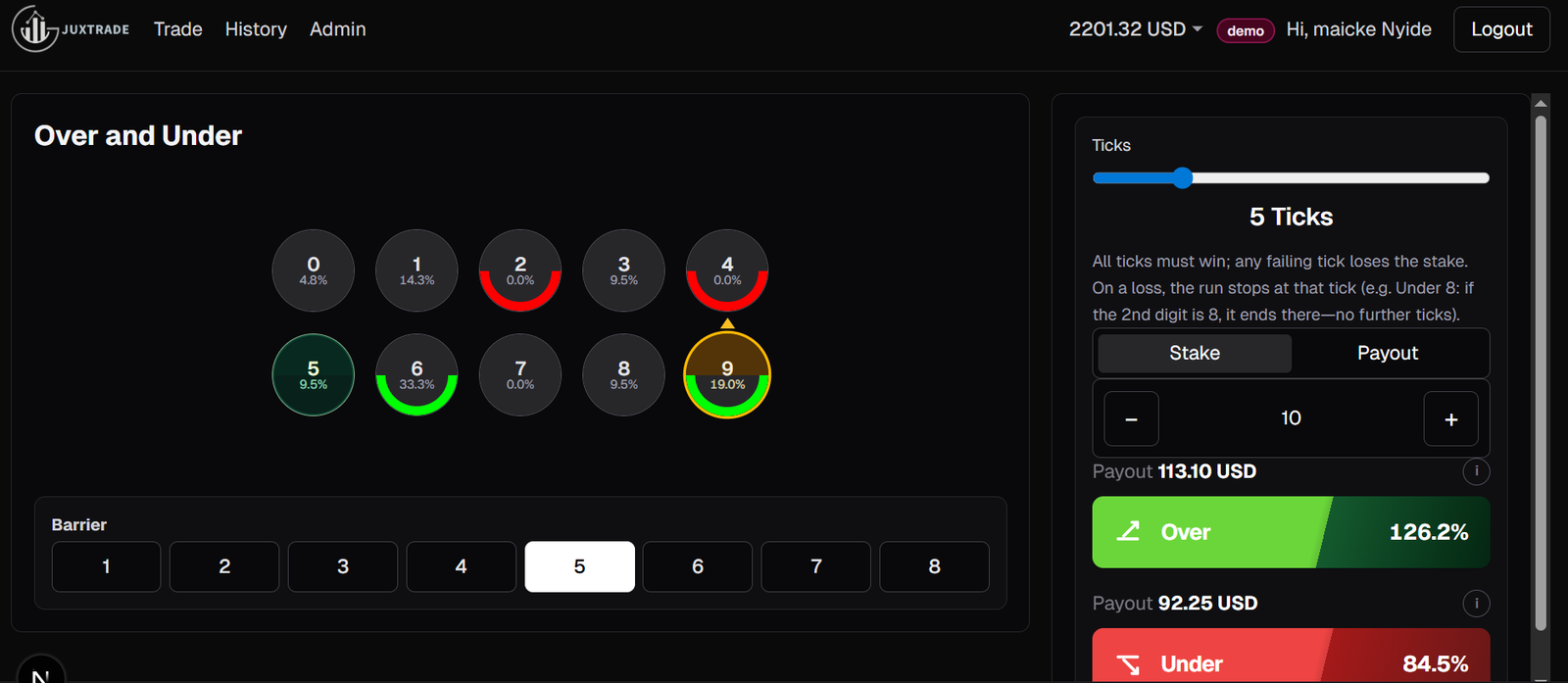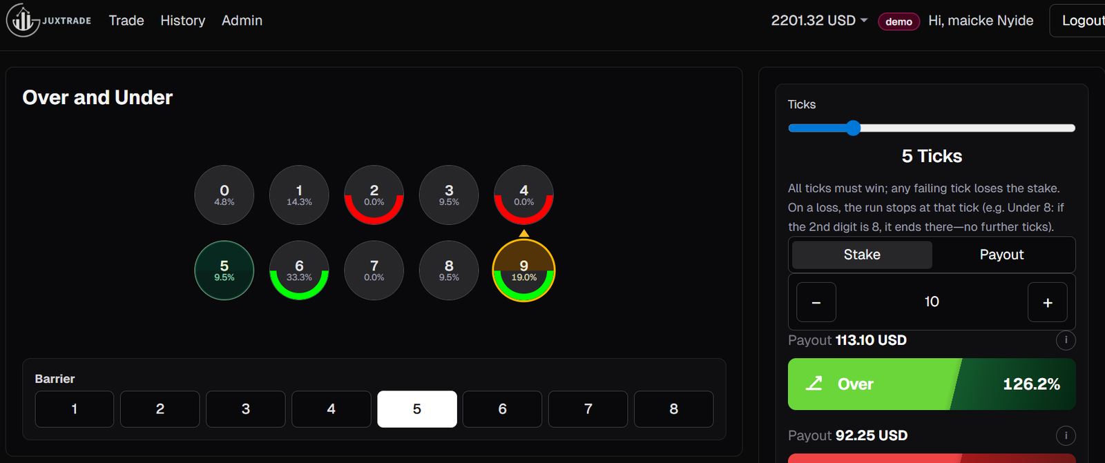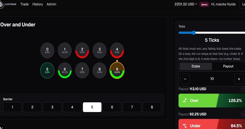 The trading interface is designed to provide a clear and intuitive experience. The main screen displays a visual representation of digits from zero to nine arranged in a circular format. These digits represent possible outcomes of the last digit of the market tick. As market data updates in real time, the active digit is highlighted, allowing users to observe patterns and recent digit history. Alongside the digit display is the trading panel where users can configure their trade parameters, including selecting the barrier digit, choosing between the Over or Under prediction, and entering the stake amount before confirming the trade.