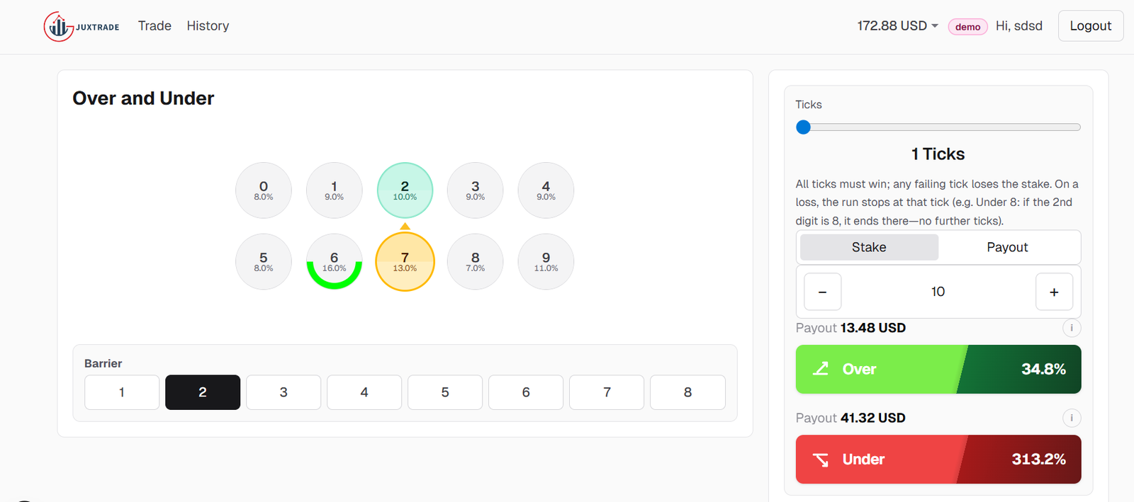 When a user submits a trade, the platform records the trade request and waits for the next market tick from the data source. Once the new tick arrives, the system extracts the final digit of the price and compares it with the selected barrier digit. Based on the comparison and the chosen prediction type, the platform determines whether the contract wins or loses. The result is immediately displayed in the user interface and the user’s account balance is updated accordingly.