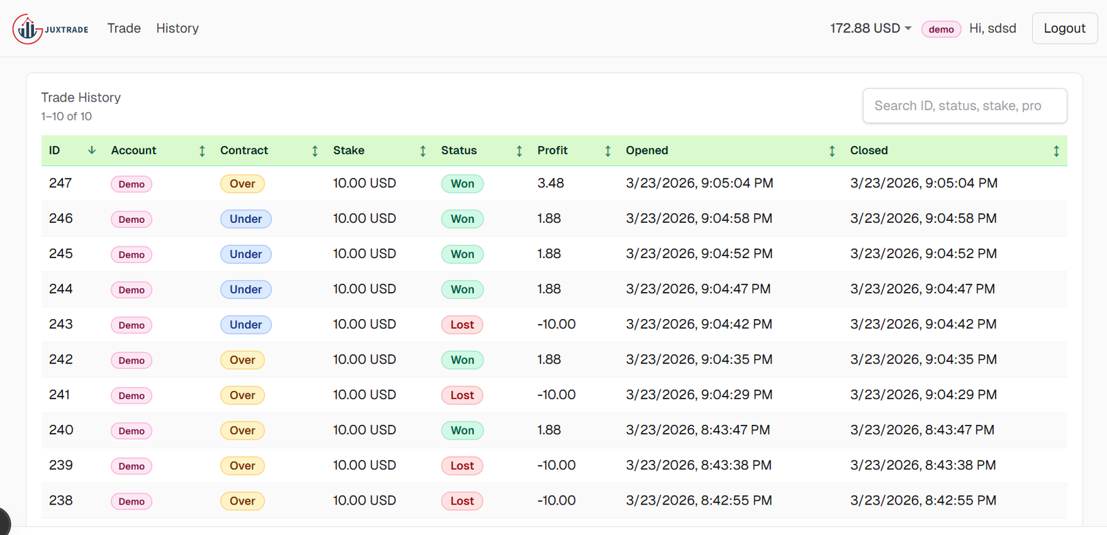 The platform follows a secure client server architecture to ensure fairness and prevent manipulation. All trade validation, outcome calculations, and account balance updates occur on the backend server rather than in the browser. The web interface functions only as a presentation layer that sends requests and displays results returned by the server. This design prevents users from manipulating outcomes through browser tools or client side scripts.