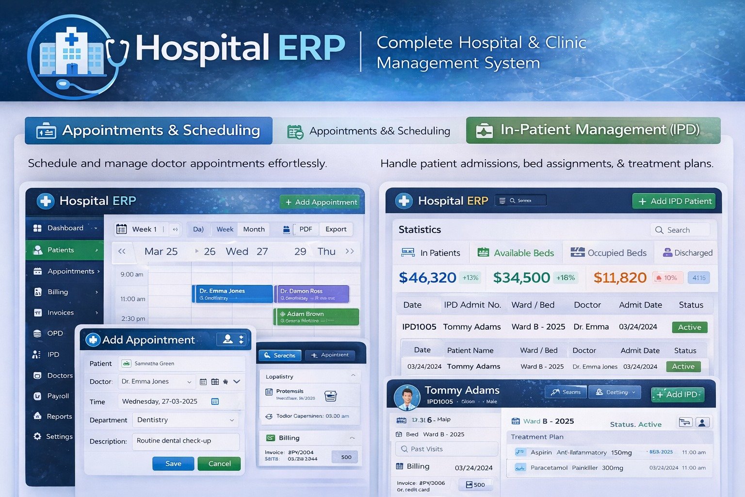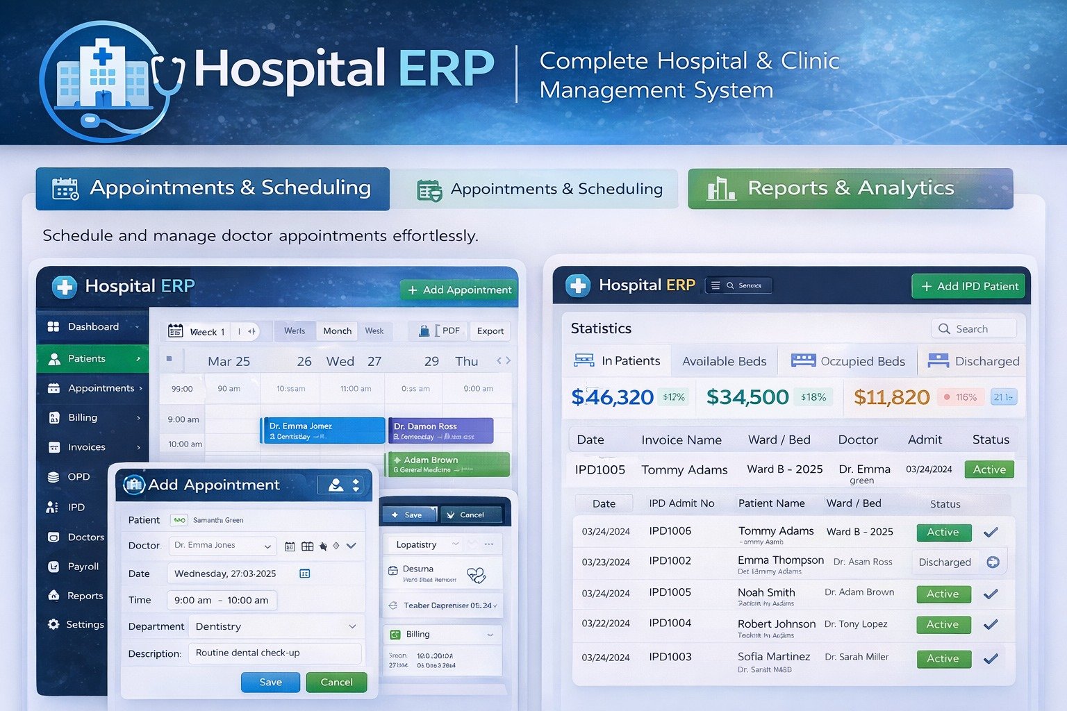 Hospital ERP is a complete hospital and clinic management system designed to centralize patient care, appointments, billing, admissions, diagnostics, pharmacy, reporting, and day-to-day hospital operations in one platform.